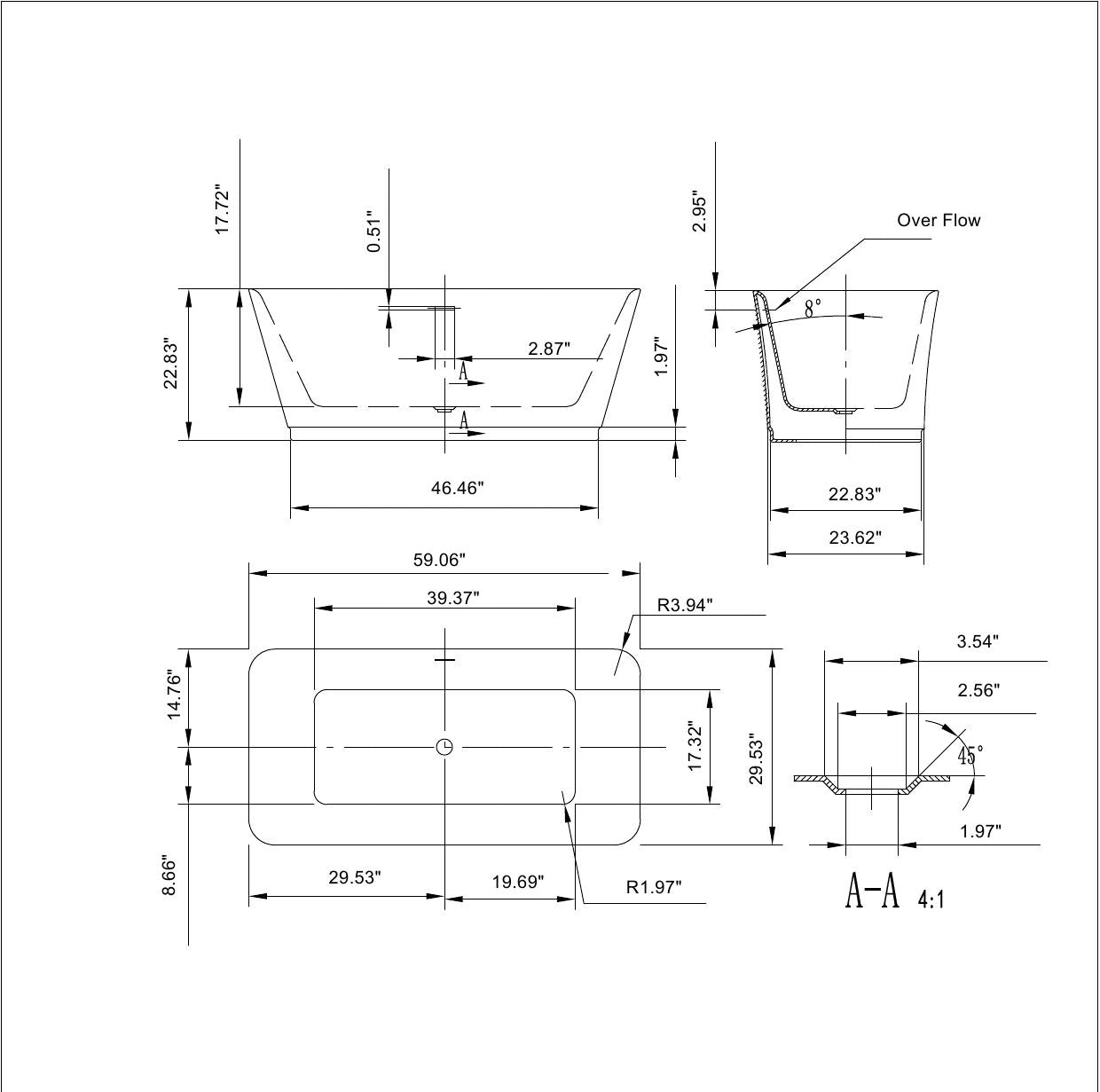 Bathtub exterior dimension: 59 L x 29.52 W x 22.83 D inch – effective tub capacity: 56 gallons, chrome drain, and overflow included, tub filler excluded