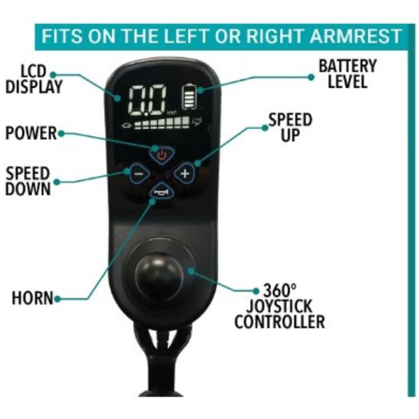 The power on/off switch, speed selection buttons, horn button, battery level display, and 360-degree joystick are all located on the controller. To top it off, this power chair also has an optional remote control for a caretaker to operate and steer the unit, which is unique to a folding power wheelchair.