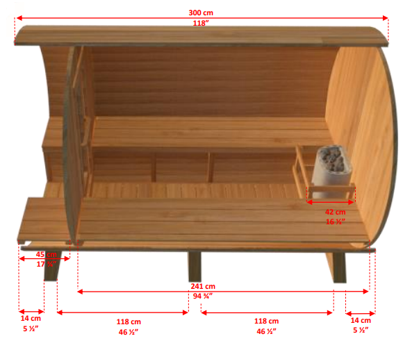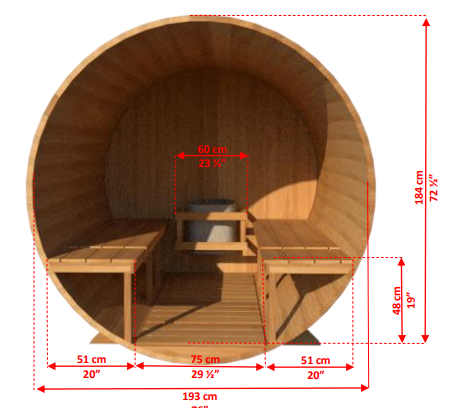 This Canadian Timber Tranquility Barrel Sauna with 45cm Porch is handcrafted from Eastern White Cedar that we use in all other CT models. This Sauna kit comes with solid cedar cradles, aluminum bands with stainless steel hardware and is packaged in a ready to assemble kit. The round concept of the barrel sauna makes it unique and very efficient to heat as well as encourages proper airflow during sauna use.